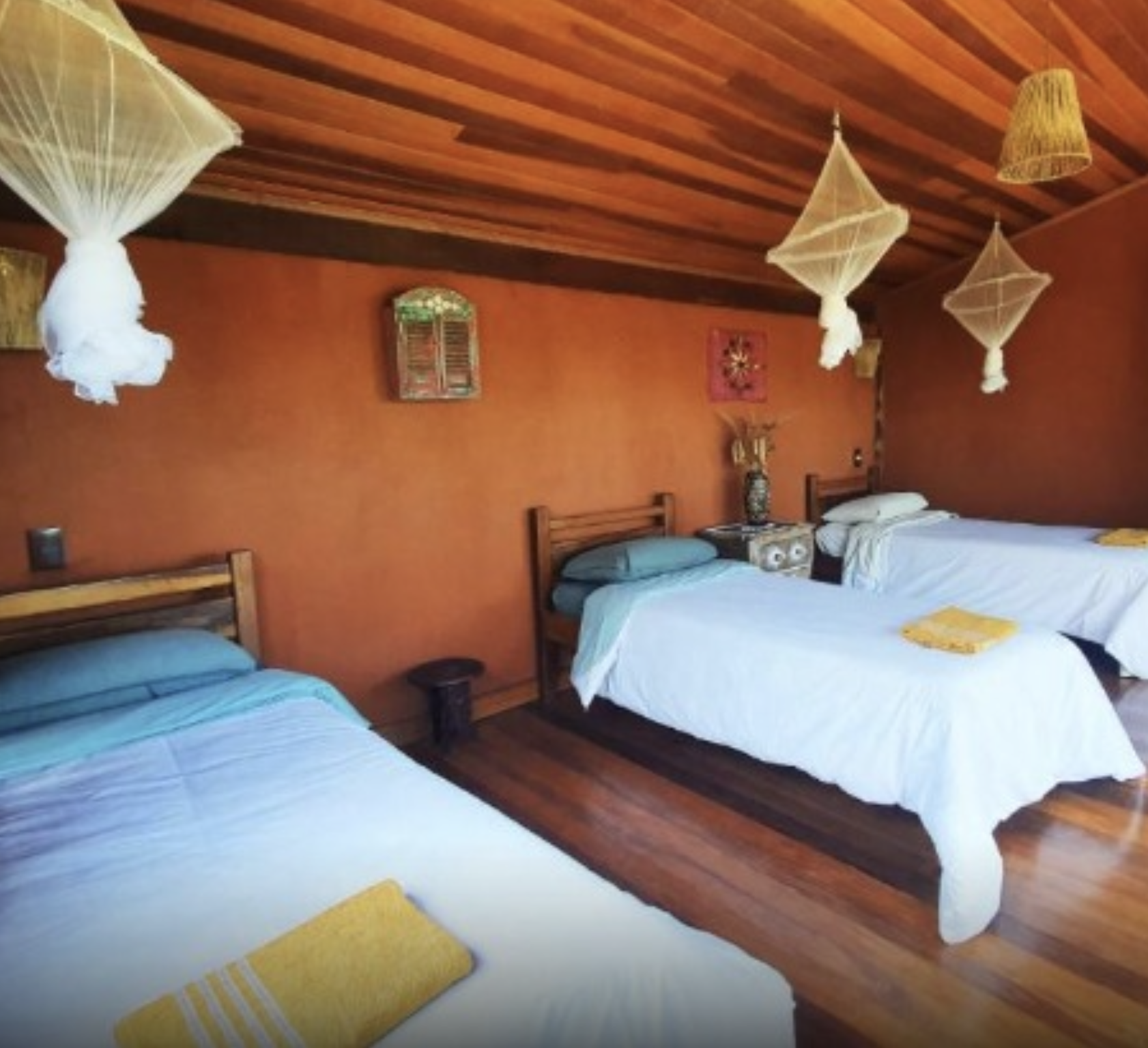 Equipado com três camas de solteiro, ar condicionado, banheiro privado (dividido entre os integrantes do quarto) e varanda.